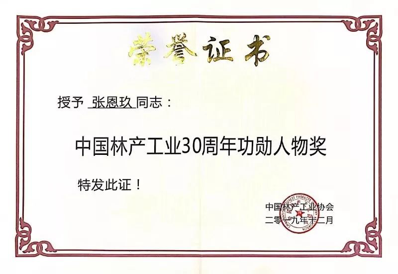 久盛地板主席張恩玖先生被授予中國林產工業30周年功勛人物獎