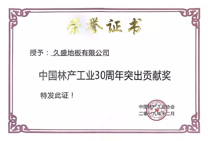 中國林產工業創新獎是國家林業與草原局2009年核定的9個評比表彰項目中的一項,久盛地板在中國林產工業30年周年之際被授予“中國林產工業行業創新獎”與“中國林產工業30周年突出貢獻獎”榮譽稱號。