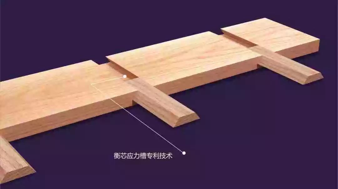 了解了這個原理研發出的衡芯技術,借鑒中國榫卯結構原理,采用同材質的木條以插銷的形式安裝在長板里,每個長板中有三個插銷。因為是同材質的木條,所以能夠做到同脹同縮。讓每個插銷產生分割應力作用,抑制變形,實現小木條起到大作用。