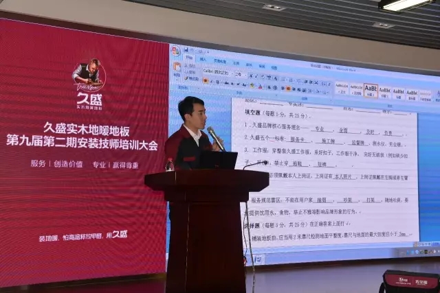 培訓(xùn)會(huì)上,久盛服務(wù)部部長(zhǎng)趙京濤、CRM部部長(zhǎng)莫越峰、產(chǎn)品管理部部長(zhǎng)徐立合力為學(xué)員帶來(lái)一堂堂專業(yè)、生動(dòng)、有效的課程,濃厚的課堂氛圍提高了全員的學(xué)習(xí)興趣。每一位學(xué)員認(rèn)真聽(tīng)取有關(guān)于“實(shí)木地暖地板安裝服務(wù)規(guī)范”、“實(shí)木地暖地板安裝標(biāo)準(zhǔn)”的理論知識(shí),且通過(guò)及時(shí)有效的一場(chǎng)模擬考試,鞏固已習(xí)得的寶貴財(cái)富,將“好服務(wù)”的精髓爛熟于心: